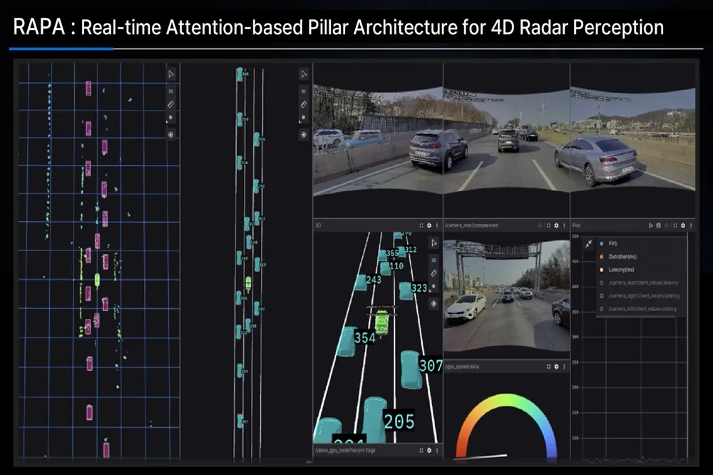 RAPA (실시간 Attention 기반 기둥 아키텍처) – 다수의 4D 이미징 레이더만으로 360° 주변환경을 인식하는 소프트웨어 정의 자율주행 인지 엔진으로, 레이다 데이터의 희소성과 노이즈를 극복하는 딥러닝 모델을 통해 LiDAR 수준의 정밀 객체 탐지·추적을 실시간 구현.