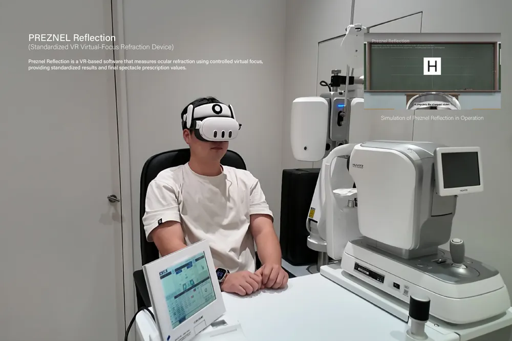 Fresnel Reflection is the world's first refraction measurement program using a VR headset. It evaluates refractive errors by presenting focus-adjustable visual stimuli in virtual reality without traditional equipment.