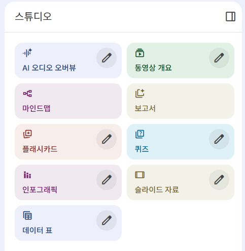 NotebookLM은 Studio에서 Audio Overview / Video Overview / Slide Deck / Infographic 같은 산출물을 만들 수 있습니다(권한/플랜에 따라 가능 범위가 달라질 수 있음).