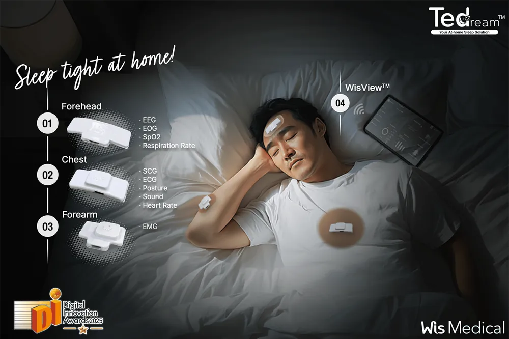 Tedream은 집에서 붙이고 자는 방식으로 수면무호흡증을 진단하는 패치형 접근을 보여줍니다.