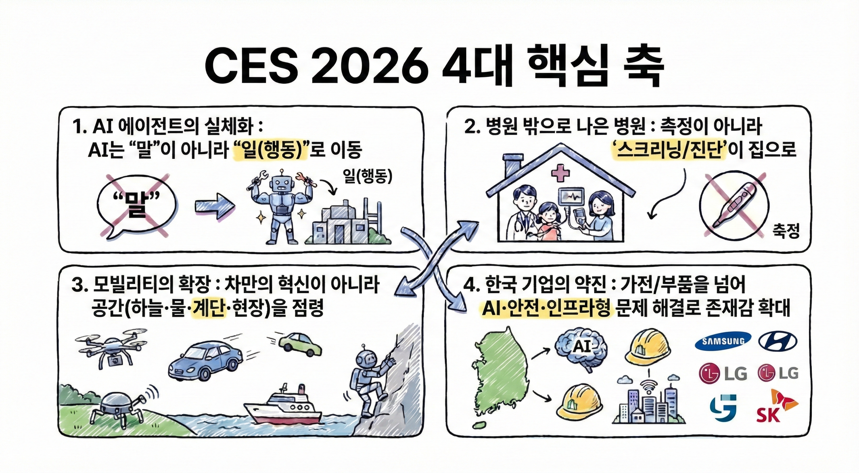 핵심은 거창한 선언문이 아니라, 4개의 렌즈(축)로 보면 CES 2026이 또렷해진다는 메시지예요.