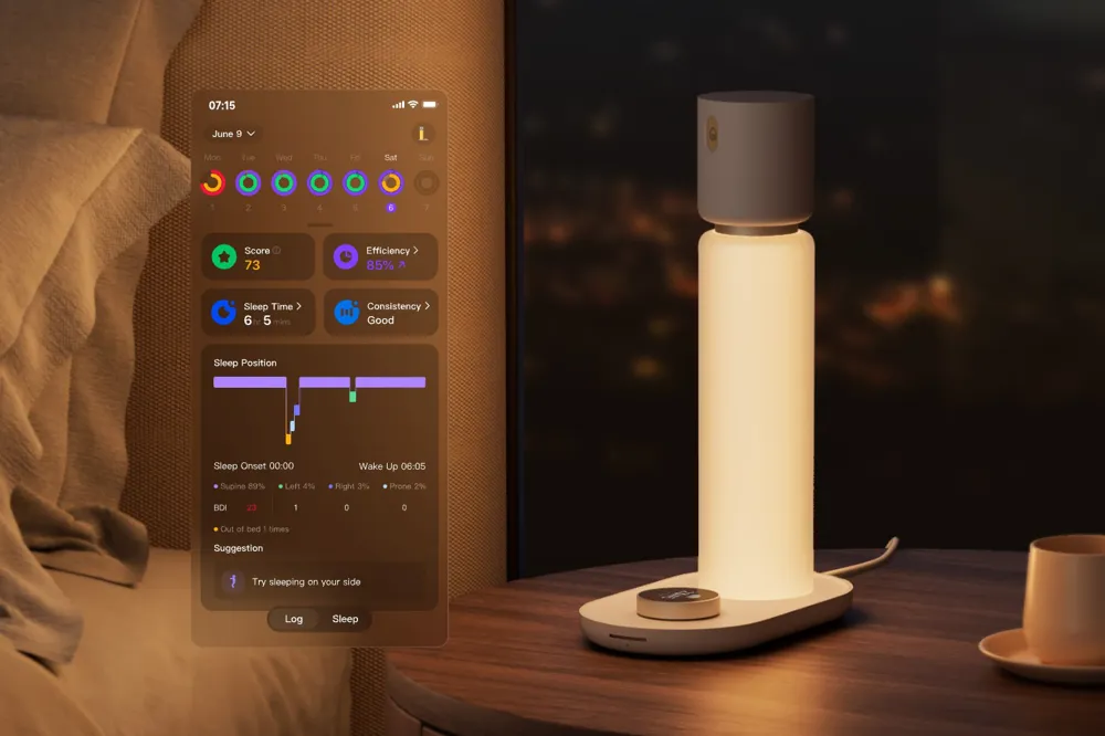 Sleepal AI 램프는 침대 옆 램프 하나로 비접촉 수면 모니터링과 환경 제어를 동시에 합니다. mmWave 레이더, 열 감지, 마이크를 내장해 사람의 움직임, 호흡, 코골이 등을 센싱하고, 방 안의 온도·습도까지 측정합니다. 그 데이터를 AI가 분석하여 사용자가 깊은 잠에 들면 조도와 색온도를 조정하고, 이완을 돕는 명상 사운드 재생 등 맞춤 환경을 자동 세팅합니다. 아침에는 서서히 밝아지는 빛으로 자연스럽게 깨우며, 여러 명이 함께 자는 방에서도 각 개인의 수면을 구분해 인사이트를 제공할 정도로 정교합니다. 기존 수면 트래커+환경제어기를 통합한 올인원 솔루션이라는 점에서 유일합니다.