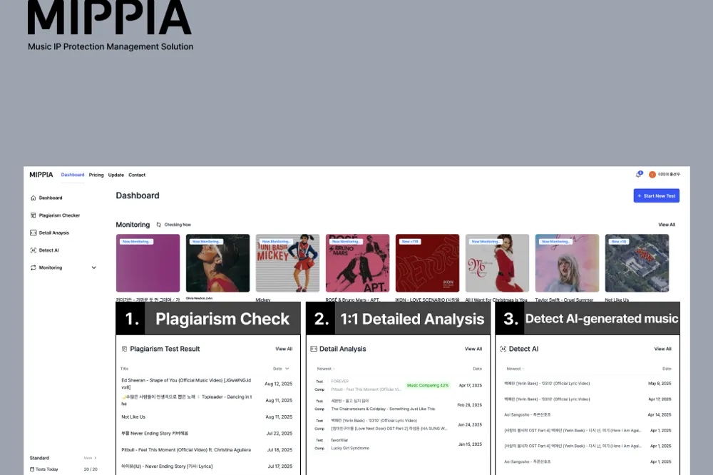 글로벌 음원 데이터 모니터링과 API 통합을 통해 실시간 표절 감시 기능을 제공하는 점도 차별점입니다.