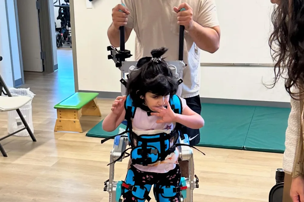 신경계 질환으로 보행에 어려움을 겪는 아동을 위해 착용형 외골격을 통해 재활훈련과 보행 능력 회복을 돕는 의료 로봇.